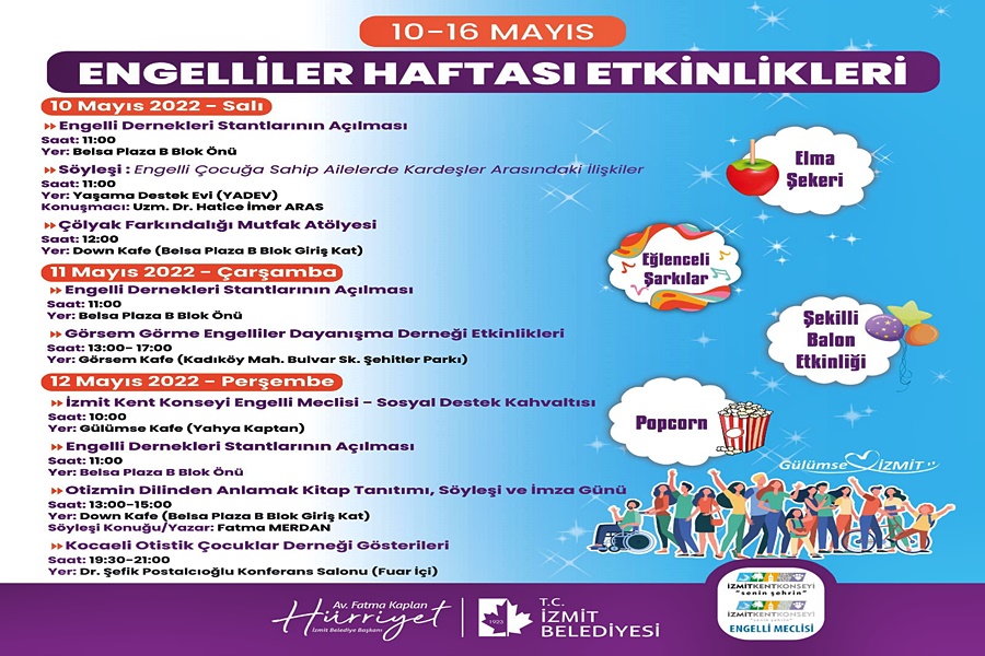 İzmit Belediyesi Engelliler Haftası’nda farkındalık yaratacak. İzmit Belediyesi, 10-16 Mayıs Engelliler Haftası kapsamında toplumsal farkındalık yaratmak amacıyla üç gün sürecek bir etkinlik programı hazırladı. İşte Engelliler Haftası Etkinlikleri