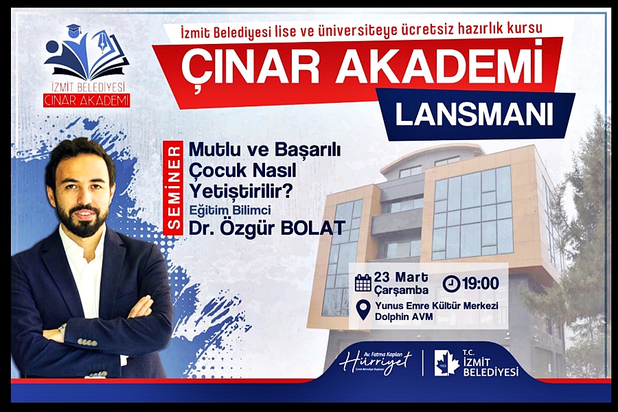 İzmit Belediye Başkanı Av. Fatma Kaplan Hürriyet öncülüğünde eğitimde fırsat eşitliğini sağlamak adına hayata geçirilecek olan ücretsiz lise ve üniversiteye hazırlık kursu Çınar Akademi ’nin lansmanı, ünlü Eğitim Bilimci Dr. Özgür Bolat’ın katılımıyla 23 Mart Çarşamba günü gerçekleşecek