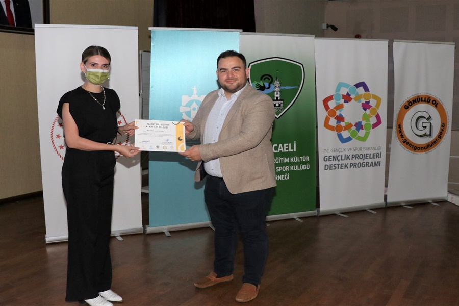 Teorik eğitimi tamamlayan gençlere düzenlenen törenle sertifikaları verildi. Programa Sağlık ve Sosyal Hizmetler Dairesi Başkanı Ebubekir Ardıç, Kocaeli Sağırlar Eğitim Kültür Gençlik ve Spor Kulübü Derneği Başkanı Hasan Aktürkoğlu ile Engelli ve Yaşlı Hizmetleri Şube Müdürü Sezer Ceyhan katıldı. Katılım sertifikası programında konuşan Kocaeli Sağırlar Eğitim Kültür Gençlik ve Spor Kulübü Derneği Başkanı Hasan Aktürkoğlu; “1980 yılında kurulan derneğimizin gençlik, spor, sanat kültür gibi branşlarda birçok faaliyeti var. 41. yıl dönümünü kutladığımız bu özel senede çok güzel bir projeye imza attık. Kocaeli Büyükşehir Belediyesi ile birlikte ortaklaşa yaptığımız bu proje için bütün yetkililere teşekkür ediyorum. Ayrıca işaret dili eğitimine katılan siz değerli öğrencilere tek tek teşekkür ediyorum” ifadesini kullandı.