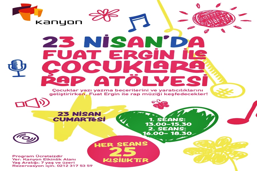 Açıldığı ilk günden beri çocuklar için düzenlediği hem eğlenceli hem de yaratıcı etkinliklerle fark yaratan Kanyon, 23 Nisan’da tüm çocukları “Fuat Ergin ile Rap Atölyesi” etkinliğiyle bir kez daha bir araya getiriyor.
