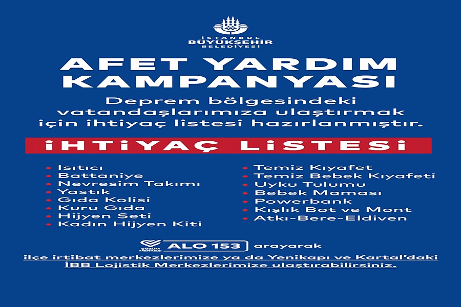 Bağış yapmak isteyen İstanbullular ALO 153 Çözüm Merkezi numarası üzerinden ‘Deprem Hattı’na bağlanarak ihtiyaç listelerine ulaşabilirler. İstanbullular, yardım malzemelerini Yenikapı Avrasya Gösteri Merkezi ile Kartal Lojistik Merkezi’ne bırakabilirler. Yardım kampanyası kapsamında ikinci el ürünler kabul edilmeyecek, sadece kullanılmamış ürünler değerlendirilecek.