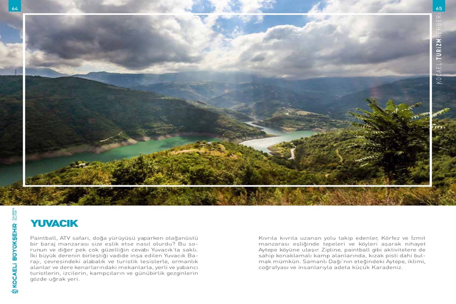 Yaz turizminden, doğa turizmine, tarihi ve kültürel miraslarımızdan, büyüleyici güzelliklere kadar her şeyin yer aldığı Kocaeli Turizm Rehberinde birçok önemli bilgiler verildi. Rehberde eşsiz coğrafyasıyla Kandıra sahilleri, mavi bayraklı plajlar, yürüyüş ve bisiklet turları için vazgeçilmez doğa turizmi parkurları, Kocaeli’nin eşsiz gastronomik değerleri ve coğrafi işaretli ürünleri, Ormanya, Kartepe, Akçakoca Anıt Mezarı, Gebze Çoban Mustafa Camii gibi değerlerin hepsi Mutlu Şehir Kocaeli için özenle tanıtıldı.