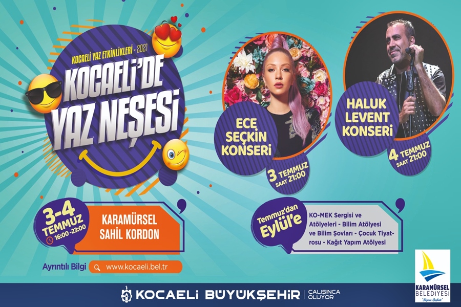 Öte yandan Kocaeli’de Yaz Neşesi’nin ilk konserini pop sanatçısı Ece Seçkin verecek. Seçkin, en güzel şarkılarını Karamürselliler için söyleyecek. Konser öncesinde ise, Karamürsel Sahili’nde, Kültür Sosyal İşler Dairesi Başkanlığı’na bağlı Müzeler, Yaygın Eğitim Şube Müdürlüğü KO-MEK, Şehir Tiyatroları, Turizm ve Doğal Yaşam Alanları ve Kültür Sanat ve Konservatuvar Şube Müdürlüklerinin atölyelerinden oluşan stantlar kurulacak.