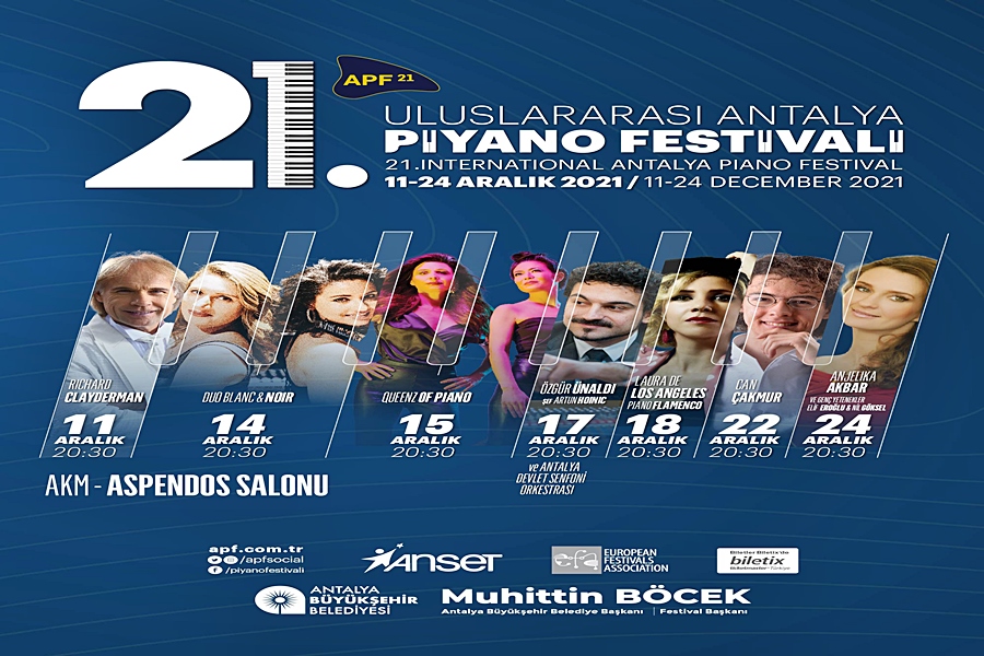 Bu yıl 21’incisi düzenlenen Antalya Büyükşehir Belediyesi’nin en önemli kültür-sanat etkinliklerinden biri olan Uluslararası Antalya Piyano Festivali 11 Aralık’ta başlıyor. Heyecanla beklenen etkinlik, dünyaca ünlü birçok yıldızı müzikseverlerle buluşturmaya hazırlanıyor. Yıldızlar geçidine sahne olacak festivalde bu yıl Richard Clayderman, Duo Blanc&Noir, The Queenz Of Piano, Artun Hoinic şefliğinde ve Antalya Devlet Senfoni Orkestrası eşliğinde Özgür Ünaldı, Laura De Los Angeles, Can Çakmur ve Anjelika Akbar yer alıyor.