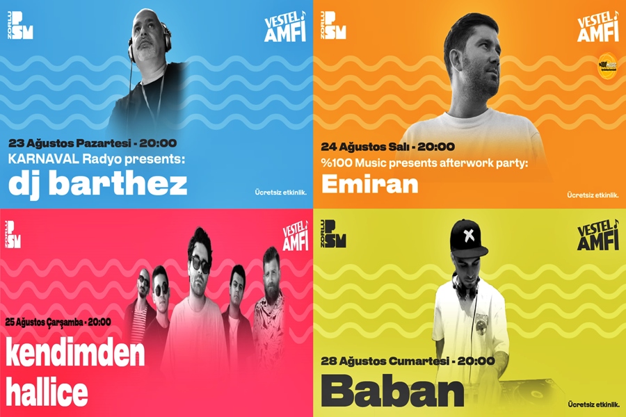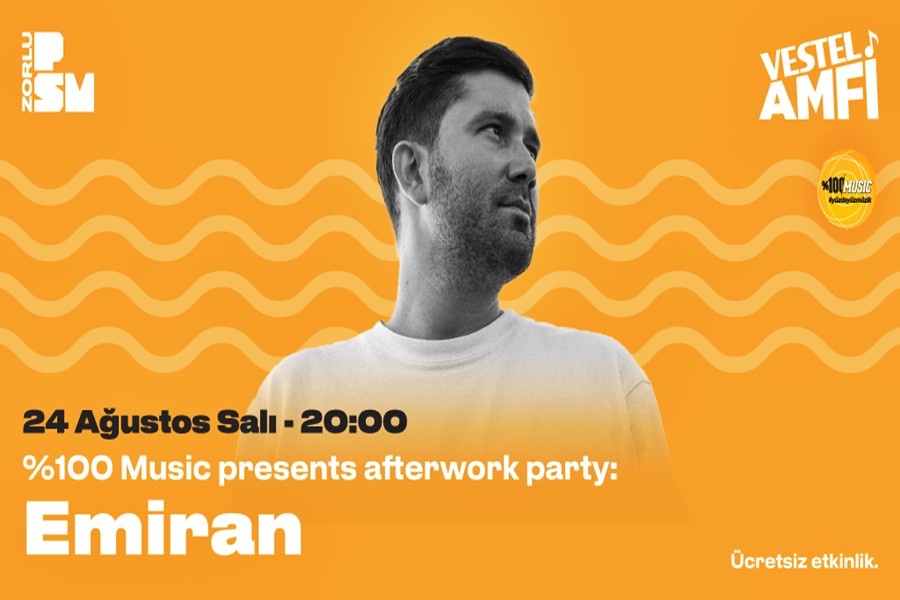 İş çıkışlarında PSM’nin en sevilen yerlerinden Vestel Amfi’de buluşuyoruz! Zorlu PSM’nin popüler serisi “%100 Music presents After Work Party”, bu yıl da iş çıkışlarının vazgeçilmezi olmaya devam ediyor. House, nu-caz, etnik ve dünya müziği türlerinin kültürel etkilerinden ilham alan İstanbullu elektronik müzik yapımcısı ve multi-enstrümantalist Emiran setin başına geçerek bizi efsane şarkılara doyurmaya hazırlanıyor. Herkesin ücretsiz katılabileceği partide müzik, bolca dans ve barbekü Vestel Amfi’de yerini alacak.